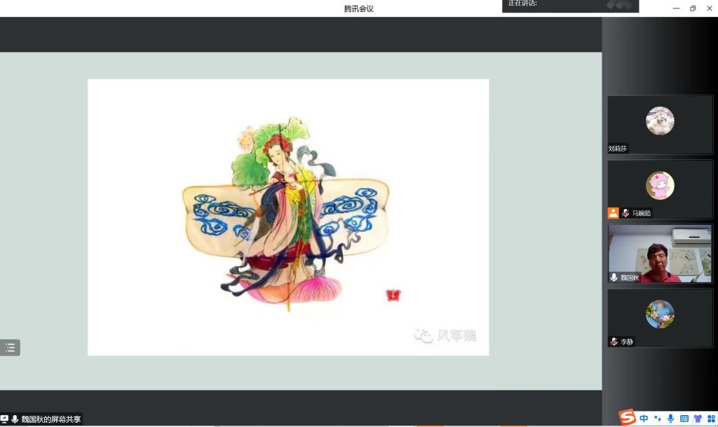 讲座开始,魏国秋首先为大家追溯了从春秋战国、两汉到两宋时期风筝的发展历史,介绍了两广地区、天津、北京、江苏各地风筝的形体特色及其通信作用、弘扬民族文化的功能。接着,魏国秋主要回忆了天津风筝魏创世人魏元泰的故事,将“风筝魏”的渊源历史图景徐徐展开,将一个个生动的故事娓娓道来,构成天津风筝发展历史的广阔风景。“风筝魏”流传至今,这一传统技艺不仅享誉国内,“风筝魏”的历代传人更将它弘扬至世界各地。第一代传人魏元泰在1912年参加太平洋地区万国博览会并获得金奖。魏国秋作为第四代传人,始终强调“民族的才是世界的”,带着浓郁的爱国主义民族情怀携其作品先后出访美国、德国、法国、意大利、比利时、加拿大、澳大利亚等国,使中国风筝的身影飘扬在各国天空,在海内外皆享有盛誉,为我国优秀传统文化走出国门做出了极大贡献。