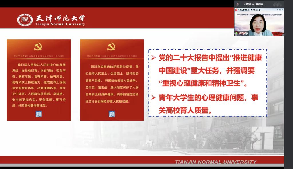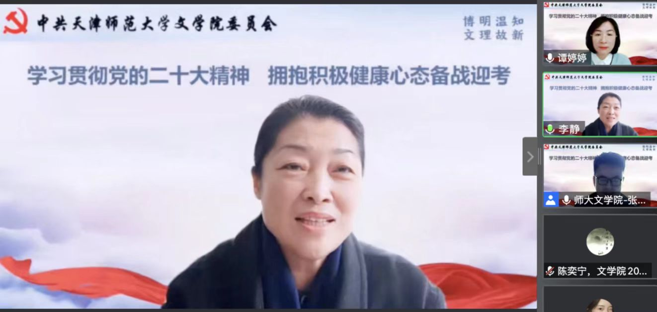 为持续深入学习宣传贯彻党的二十大精神,落实党的二十大报告中提出“推进健康中国建设”的重大任务,全面做好习近平总书记强调的“重视心理健康和精神卫生”工作。值此考研和期末考试来临之际,为更好的帮助缓解同学们考前焦虑情绪建立积极健康心态,taptap体育党委邀请天津大学心理健康中心谭婷婷老师作“学习贯彻党的二十大精神,拥抱积极健康心态备战迎考”的云端报告会。公司党委书记李静出席并讲话,各员工党支部书记、员工党员、入党积极分子等300余人线上聆听了报告。