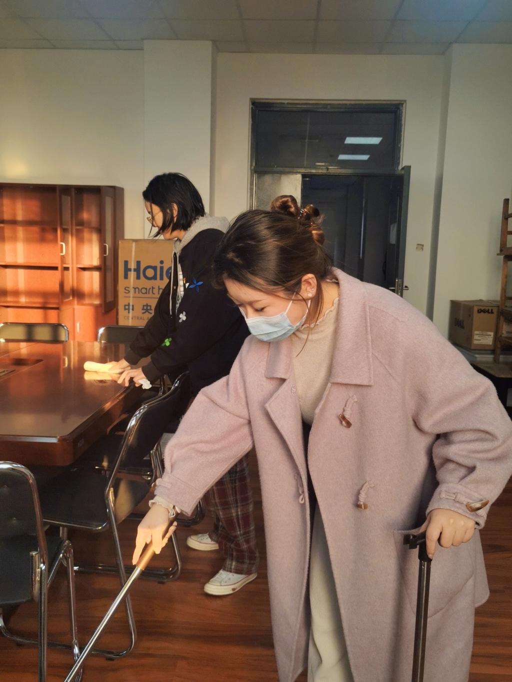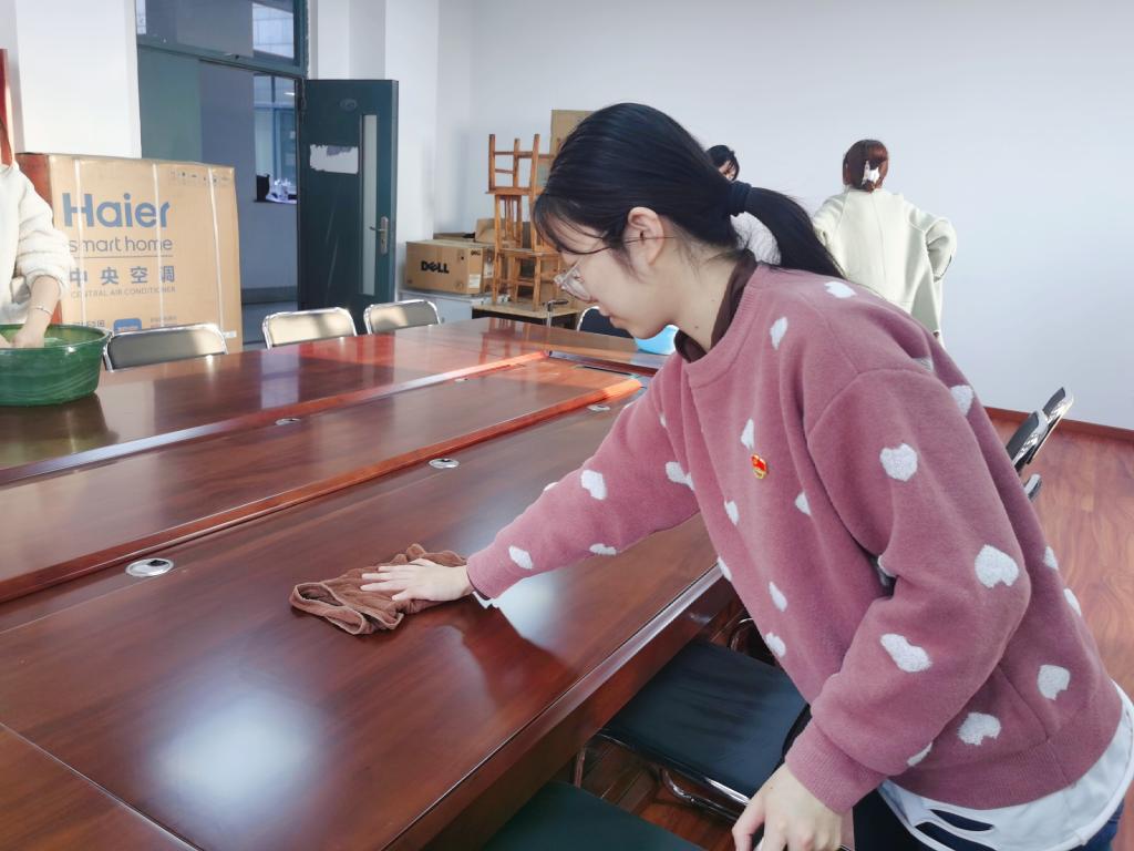 动员会后,党员同志们热血沸腾,积极争做时代急先锋,马上投入到志愿服务岗位中去,积极申报学院组织的党员实践岗。党员还积极做好传帮带工作,带领积极分子开展美化环境、卫生清扫活动。他们拿起笤帚、拖把和抹布,来到学院会议室,他们分工明确、细致入微,从窗户、窗台到置物柜、桌椅再到墙脚、地板,不放过任何一个角落,将会议室打扫得一尘不染,大家热情高涨、干劲十足,用实际行动诠释了雷锋吃苦耐劳,甘于奉献的精神。