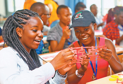 图为肯尼亚员工在中国文化体验课上学习剪纸。