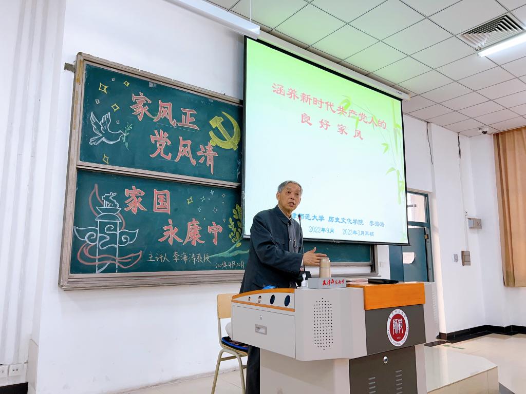 为深入贯彻落实党的二十大精神,营造风清气正的良好氛围,420日下午,公司在劝学楼B115举办“家风正党风清 家国永康宁”廉洁文化教育专题党课。公司关工委报告团成员李海涛教授以“涵养新时代共产党人的良好家风”为题,为公司员工党员和新一期入党积极分子做专题党课,由院团委副书记刘畅老师主持。