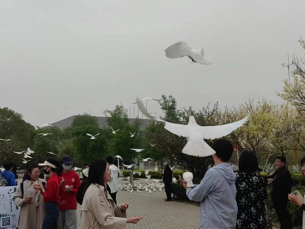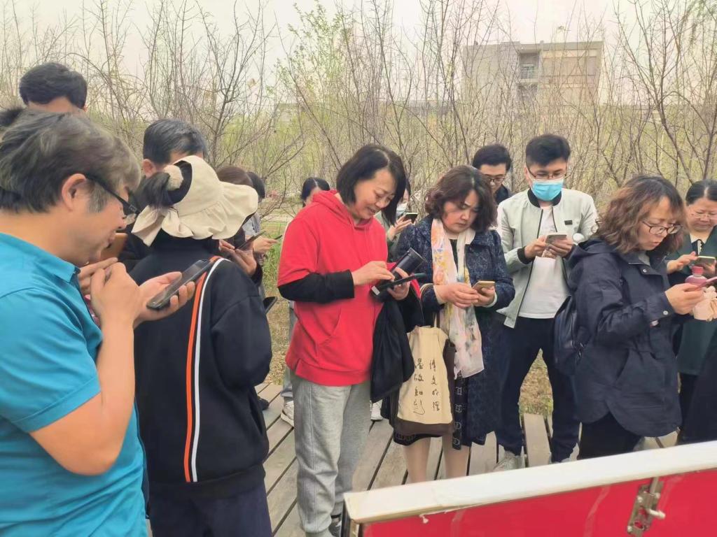全体教职工合影留念后,从兴文楼出发,由健身步道经办公楼前往金钥匙湖边。为强化教师学习掌握党的二十大知识,在员工志愿者的引导下,老师们在金钥匙湖畔和体育馆北侧相继扫码答题。员工志愿者进行科普讲解,并发放鱼食与鸽粮,帮助老师们认识了解湖中、岸边的动植物;由金钥匙湖漫步向前,师生们来到天使家园——鸽屋与鸽子亲密互动,任凭它们落在手掌或肩头,在欢快的氛围里欣赏着可爱生灵们绽放春日的姿态与魅力,感受着生命之美,共享校园生态文明建设成果。